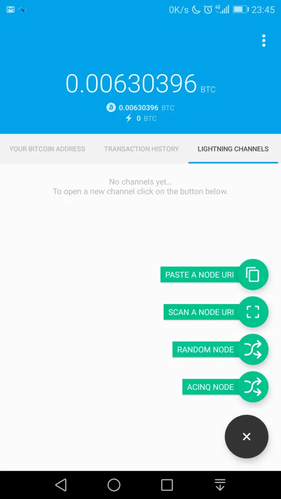 And finally, the ‘Lightning Channels’ tab is the place where you create and monitor your channels. The possible operations are copy/paste or scan a node URI, add a random node (this feature is not yet available as of version 0.3.1 of Eclair Wallet) or connect to an ACINQ node (which makes most sense anyway, it will probably be well interconnected).