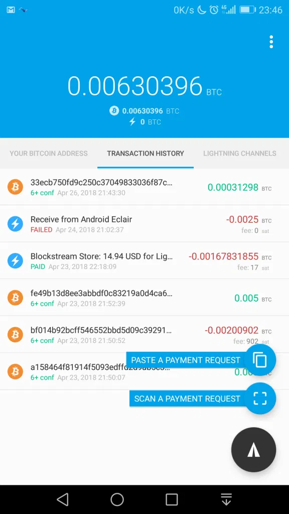 Remember how I told you about interface inconsistencies? Well, the Transaction History tab is the perfect example, because from here you also initiate both Bitcoin Mainnet and LN payments (either by scanning or copy/pasting a payment request). Perhaps if the tab was only called ‘Transactions’ it would be more intuitive. But anyway here is how it looks like: