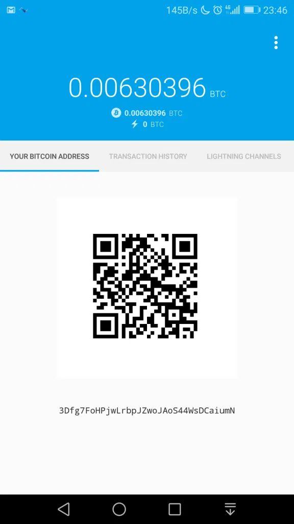 After you start the app and enter your PIN code, you are greeted by the ‘Your Bitcoin Address’ page, which is used to fund the wallet. The total available balance is shown on top, with separate readings for Bitcoin and LN balances. If you tap anywhere within the blue area, the BTC numbers will change to USD or EUR counter value depending on how you have set up the app.
