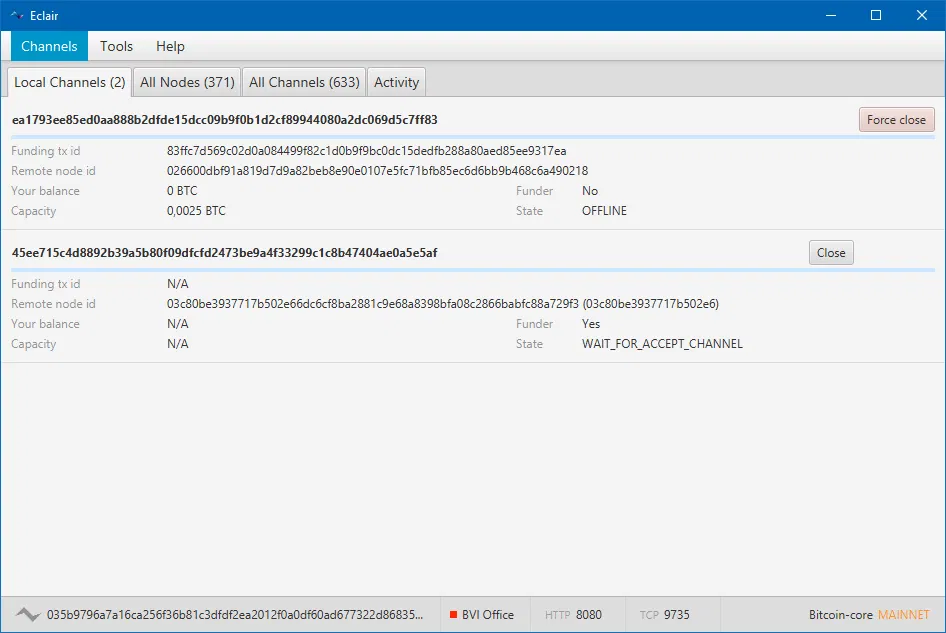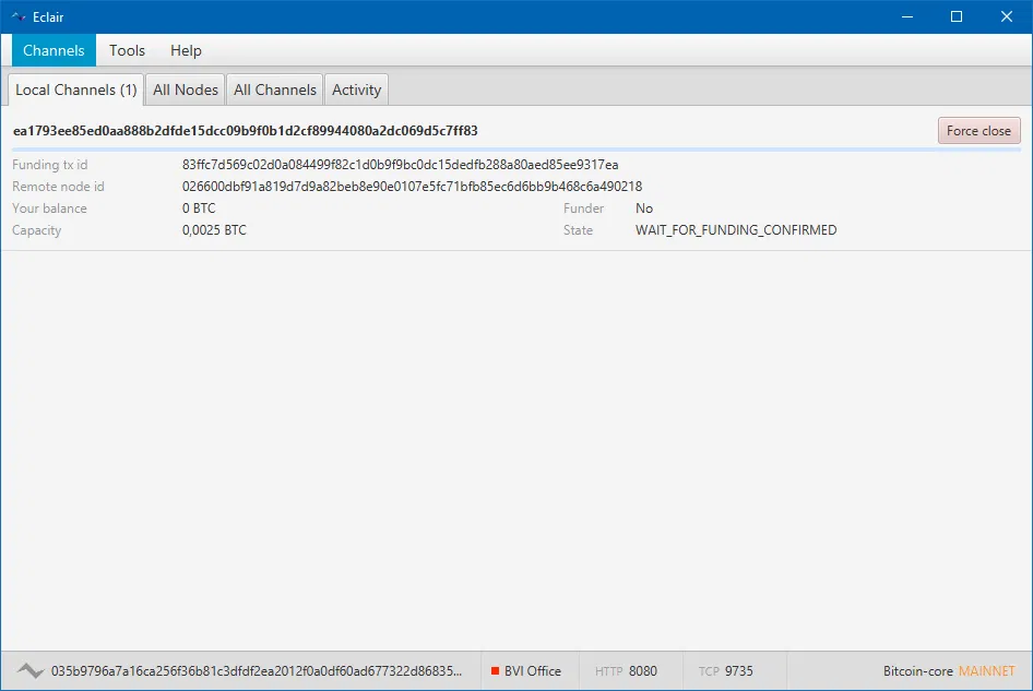 - Apr 23, 2018 21:52:39 While I waited for the 6 confirmations required by ACINQ to open my LN channel with them, I sent another 0.005 BTC from a different wallet of mine into Eclair, just for the fun of it.