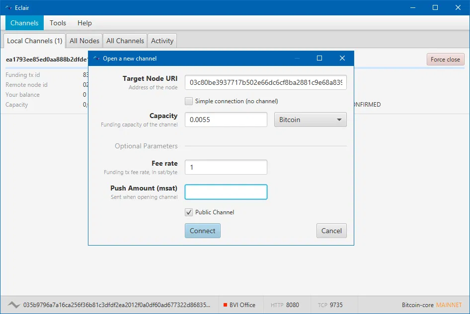The only thing that I still had to test was open another LN channel from my desktop node to another node. This would test the ability of my Eclair desktop node to command my local Bitcoin node. I used the Lightning Network Visualizer to select a well-connected node nearby and gave it a go. Because it was about 2:00am when I did this, I was about to set both the channel capacity *and* push the same amount to the other node, but I caught myself at the last moment and set Push Amount back to zero. Here goes nothing.