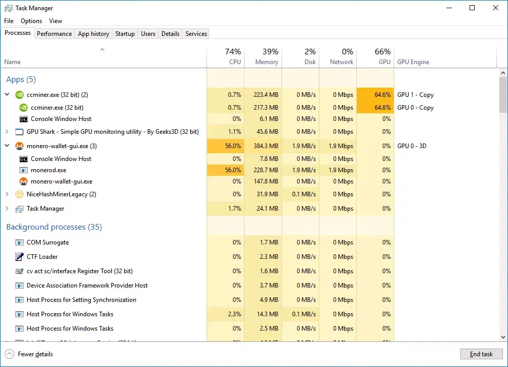 Task Manager now has a GPU load column and reports the kind of graphics operations that keep a GPU busy. Here is how my rig looks like with NiceHash running and a Monero node syncing in the background:
