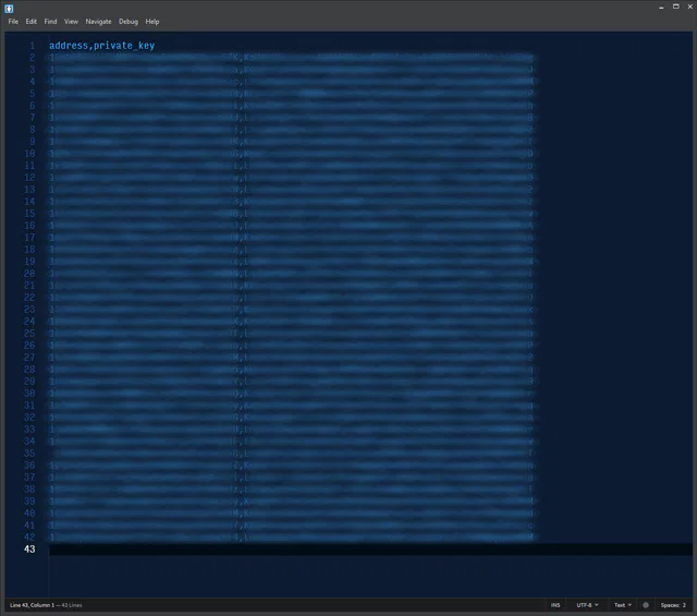 The CSV file contains all addresses and their matching private keys. They are listed there, comma separated, one pair on each line and are sorted by generation date (oldest on top). This order will become important later.