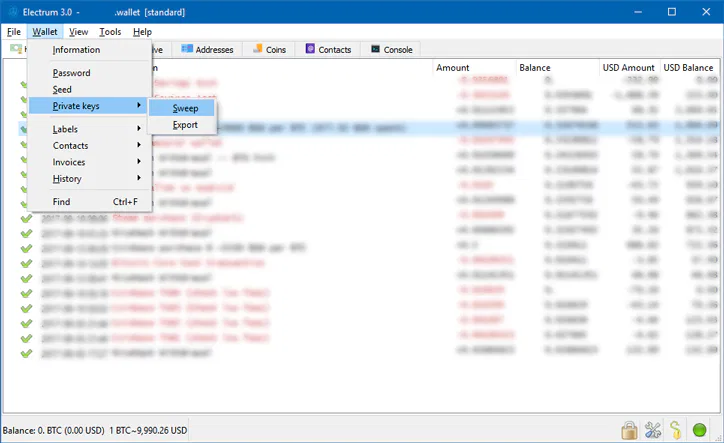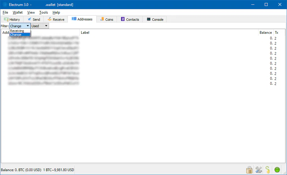 Filterdropdown, selectReceivingand thenUsed - Go back to the CSV file and locate the addresses from the Used list in Electrum, and copy their matching private keys to another text file. I’ll refer to this second file as ‘the shortlist’.